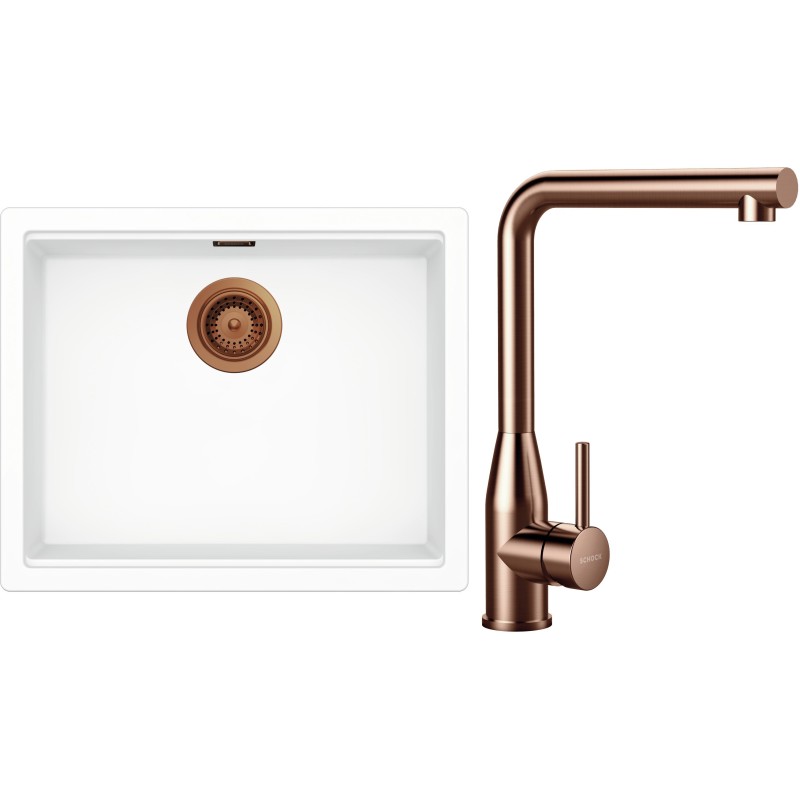 Cenově zvýhodněný set dřezu a baterie Schock S32-14 - obsahuje granitový jednodřez Kiruna N-100L Day, baterii Keto Copper brushed a části dřezu v provedení Copper brushed.