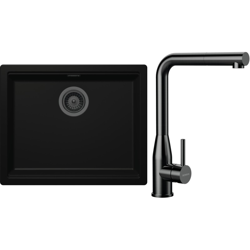 Cenově zvýhodněný set dřezu a baterie Schock S32-20 - obsahuje granitový jednodřez Kiruna N-100L Night, baterii s vytahovací koncovkou Keto.120 Gunmetal brushed a části dřezu v provedení Gunmetal brushed.