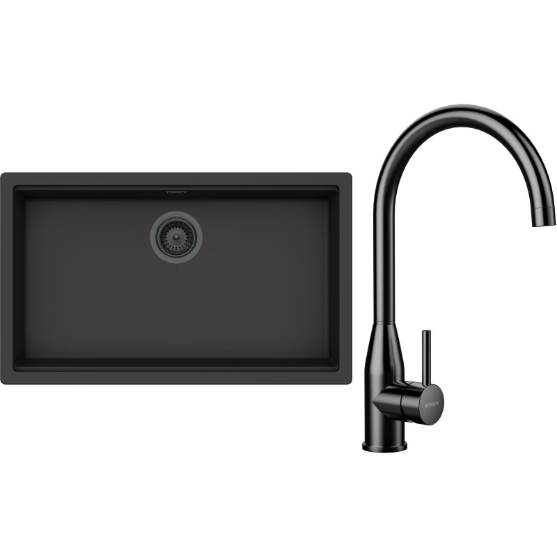 Cenově zvýhodněný set dřezu a baterie Schock S33-5 - obsahuje granitový jednodřez Kiruna N-100XL Dusk, baterii Kavus Gunmetal brushed a části dřezu v provedení Gunmetal brushed.