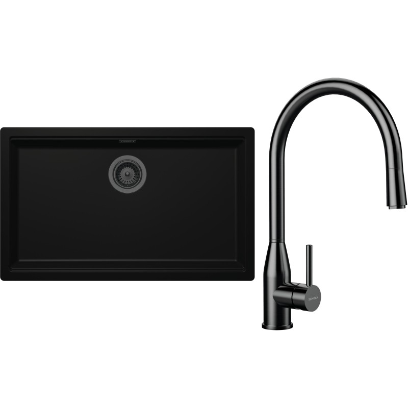 Cenově zvýhodněný set dřezu a baterie Schock S33-10 - obsahuje granitový jednodřez Kiruna N-100XL Night, baterii s vytahovací koncovkou Kavus.120 Gunmetal brushed a části dřezu v provedení Gunmetal brushed.