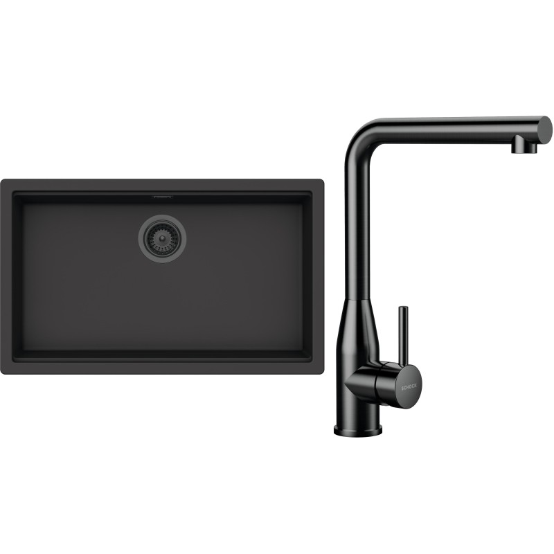 Cenově zvýhodněný set dřezu a baterie Schock S33-15 - obsahuje granitový jednodřez Kiruna N-100XL Dusk, baterii Keto Gunmetal brushed a části dřezu v provedení Gunmetal brushed.