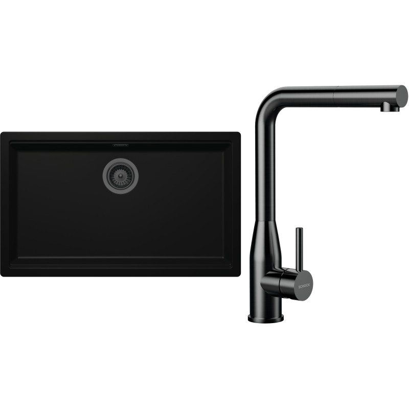 Cenově zvýhodněný set dřezu a baterie Schock S33-20 - obsahuje granitový jednodřez Kiruna N-100XL Night, baterii s vytahovací koncovkou Keto.120 Gunmetal brushed a části dřezu v provedení Gunmetal brushed.