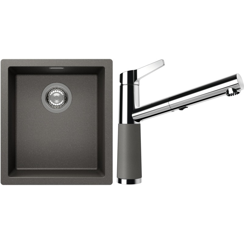 Cenově zvýhodněný set dřezu a baterie Schock S12-5 - obsahuje granitový jednodřez Kaia N-100S Silverstone a baterii se sprchou SC-510.120 Silverstone.