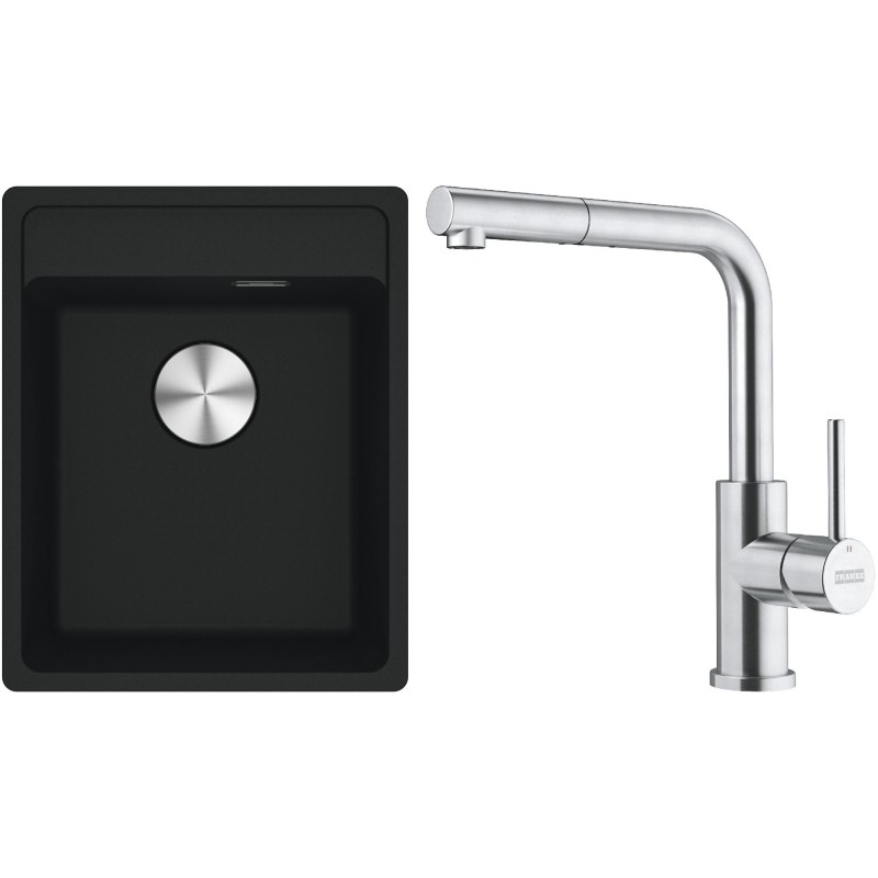 Cenově zvýhodněný set Franke G295MČ obsahuje granitový dřez jednodřez MRG 610-37 RTL Matná černá a baterii s vytahovací koncovkou FC 6986.501 SMART GLENDA Celonerez.