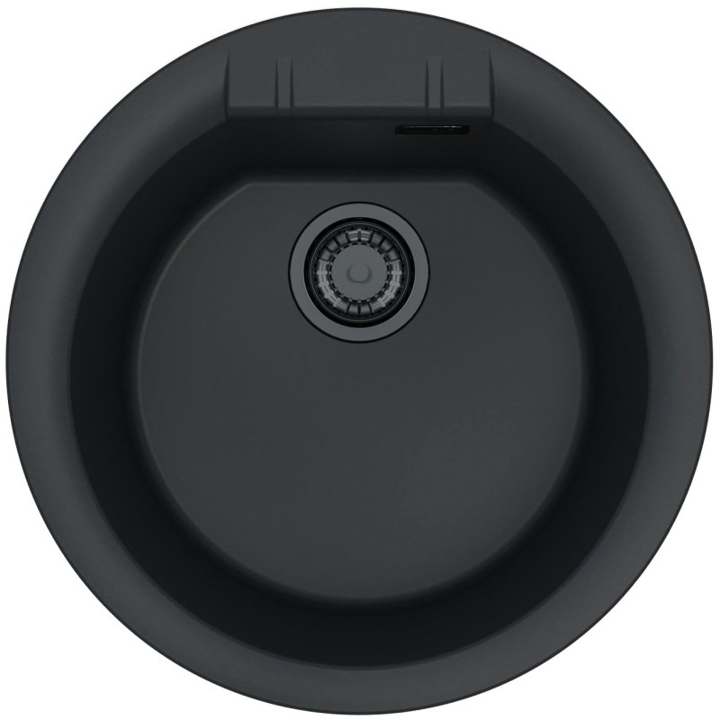 Kulatý granitový jednodřez, provedení Deep Black A90 s černými komponenty, průměr 520 mm, vana průměr 425 x 200 mm, horní montáž, minimálně 50 cm skříňka, 1 otvor z výroby.