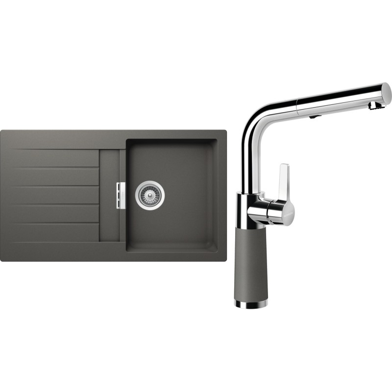 Cenově zvýhodněný set dřezu a baterie Schock S1-11 - obsahuje granitový dřez s odkapem Signus D-100 Silverstone a baterii se sprchou SC-540.120 Silverstone.