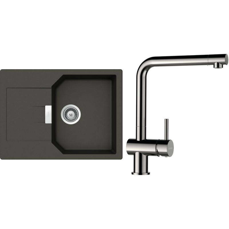 Cenově zvýhodněný set dřezu a baterie Schock S19-5 - obsahuje granitový dřez s odkapem Manhattan D-100S Asphalt a baterii Epos Nerezový vzhled.