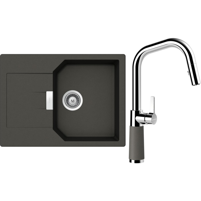 Cenově zvýhodněný set dřezu a baterie Schock S19-11 - obsahuje granitový dřez s odkapem Manhattan D-100S Asphalt a baterii se sprchou SC-530.120 Asphalt.