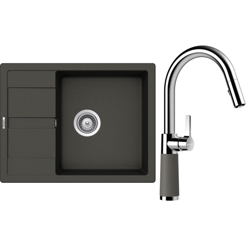 Cenově zvýhodněný set dřezu a baterie Schock S20-9 - obsahuje granitový dřez s odkapem Manhattan D-100 Asphalt a baterii se sprchou SC-520.120 Asphalt.