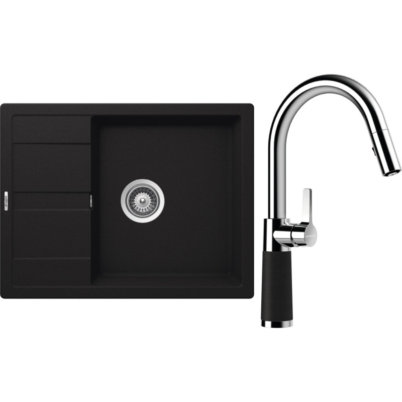 Cenově zvýhodněný set dřezu a baterie Schock S20-9 - obsahuje granitový dřez s odkapem Manhattan D-100 Onyx a baterii se sprchou SC-520.120 Onyx.