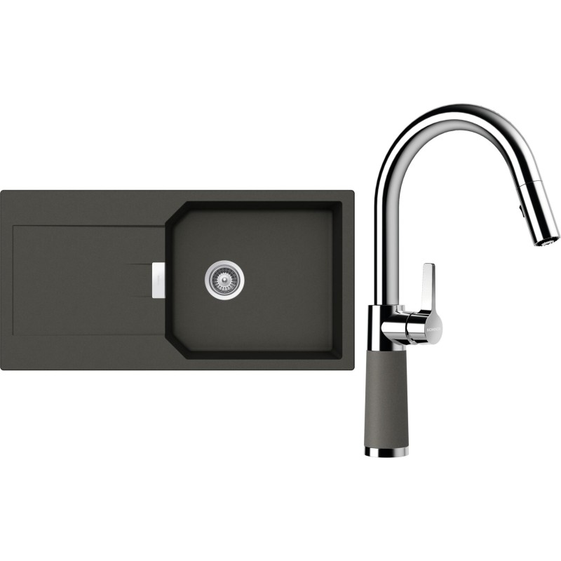 Cenově zvýhodněný set dřezu a baterie Schock S21-9 - obsahuje granitový dřez s odkapem Manhattan D-100L Asphalt a baterii se sprchou SC-520.120 Asphalt.