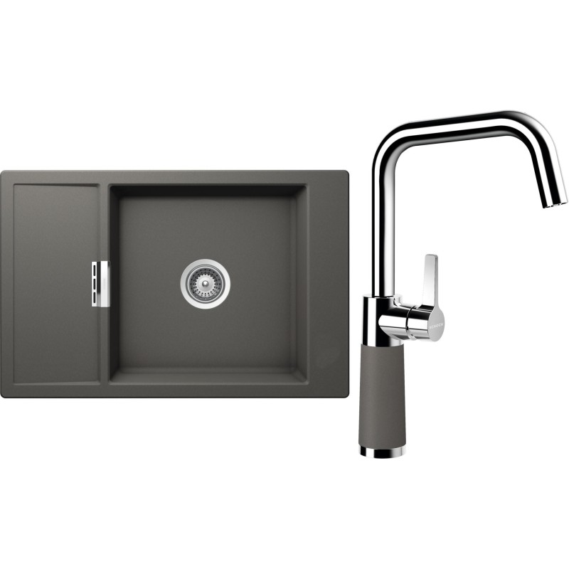 Cenově zvýhodněný set dřezu a baterie Schock S4-8 - obsahuje granitový dřez s odkapem Mono D-100XS Silverstone a baterii SC-530 Silverstone.