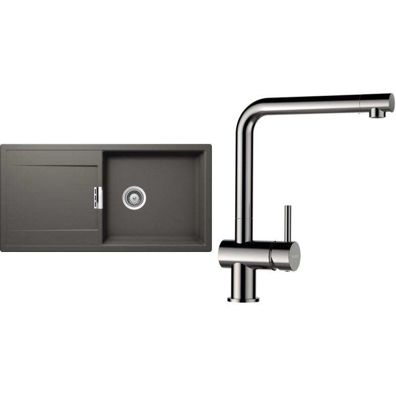 Cenově zvýhodněný set dřezu a baterie Schock S8-3 - obsahuje granitový dřez s odkapem Mono D-100L Silverstone a baterii Epos Nerezový vzhled.