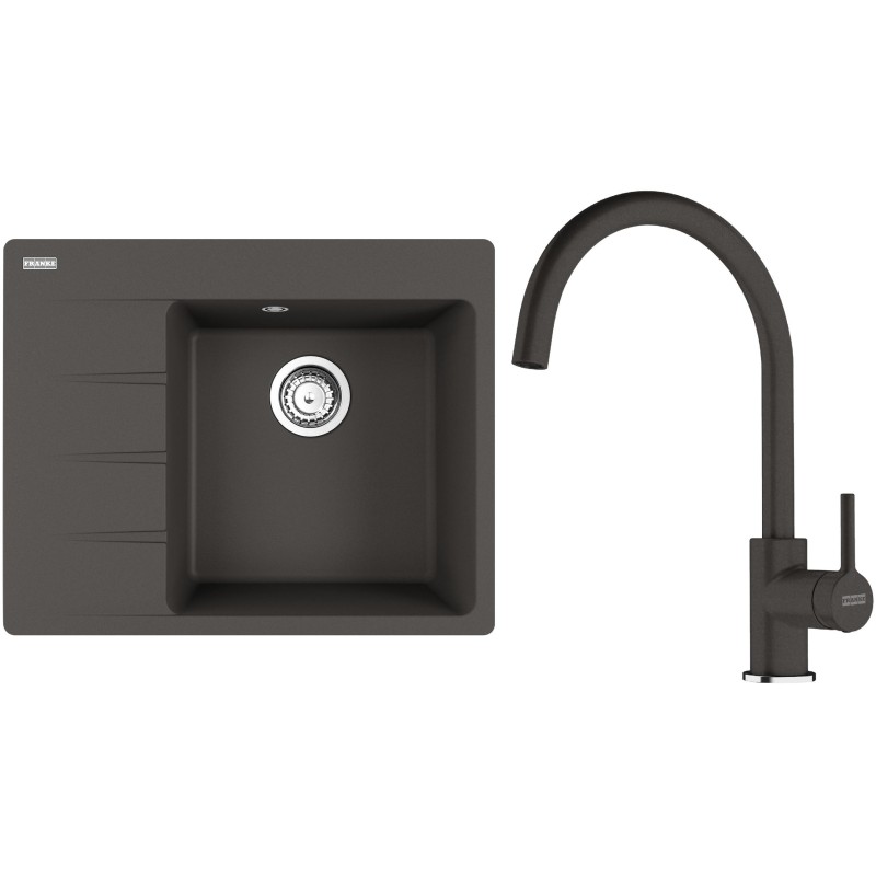 Cenově zvýhodněný set Franke G269ŠB obsahuje granitový dřez s odkapem CNG 611-62 TL/7 Šedá břidlice a baterii FC 6018.088 LINA Šedá břidlice.
