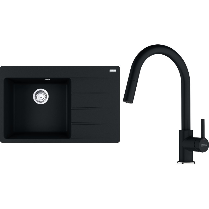 Cenově zvýhodněný set Franke G292O obsahuje granitový dřez s odkapem CNG 611-78 TL/2 Onyx a baterii s vytahovací koncovkou FC 6051.071 LINA Onyx.