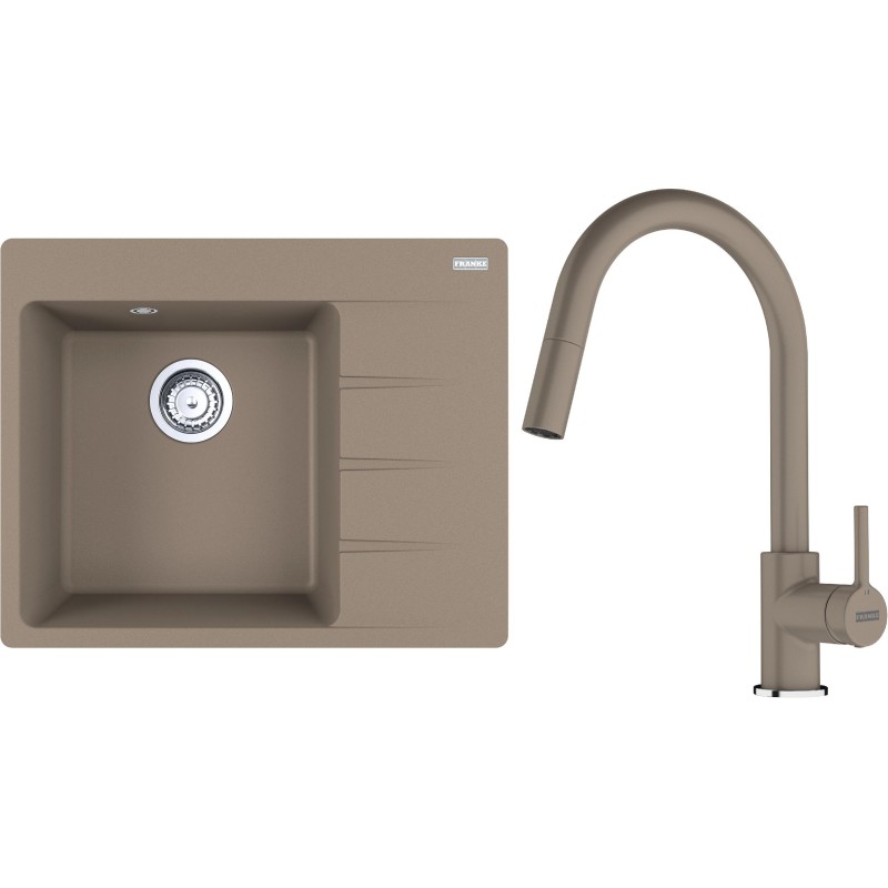 Cenově zvýhodněný set Franke G286KA obsahuje granitový dřez s odkapem CNG 611-62 TL/2 Kašmír a baterii s vytahovací koncovkou FC 6051.424 LINA Kašmír.