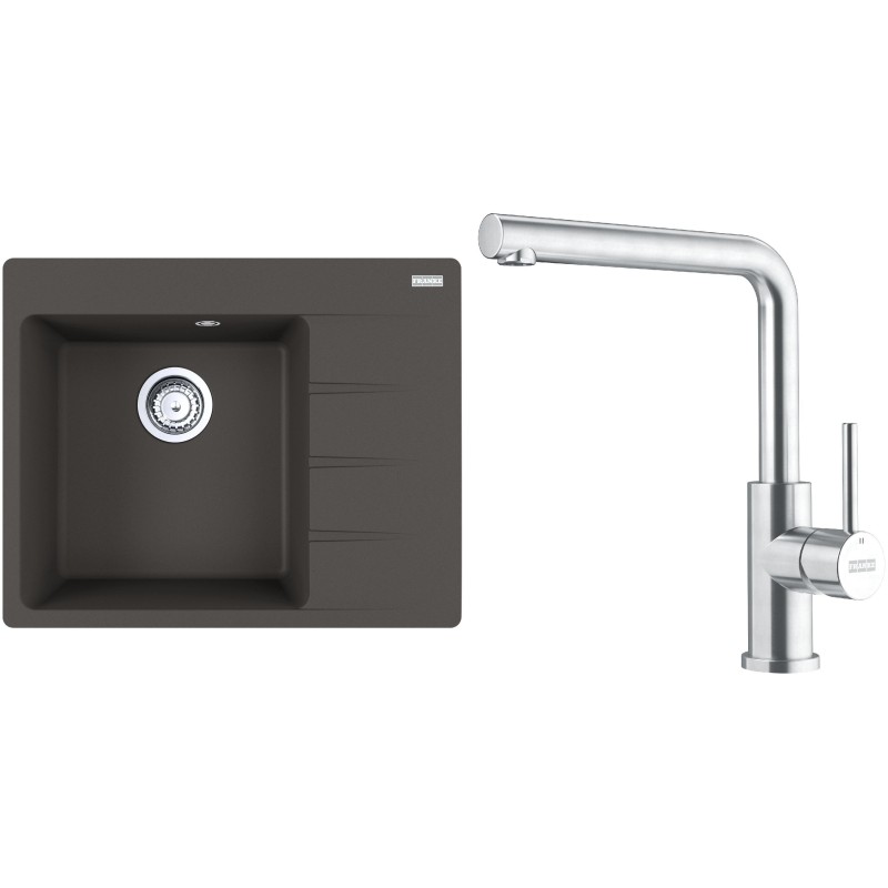 Cenově zvýhodněný set Franke G282ŠB obsahuje granitový dřez s odkapem CNG 611-62 TL/2 Šedá břidlice a baterii FC 6985.501 SMART GLENDA Celonerez.