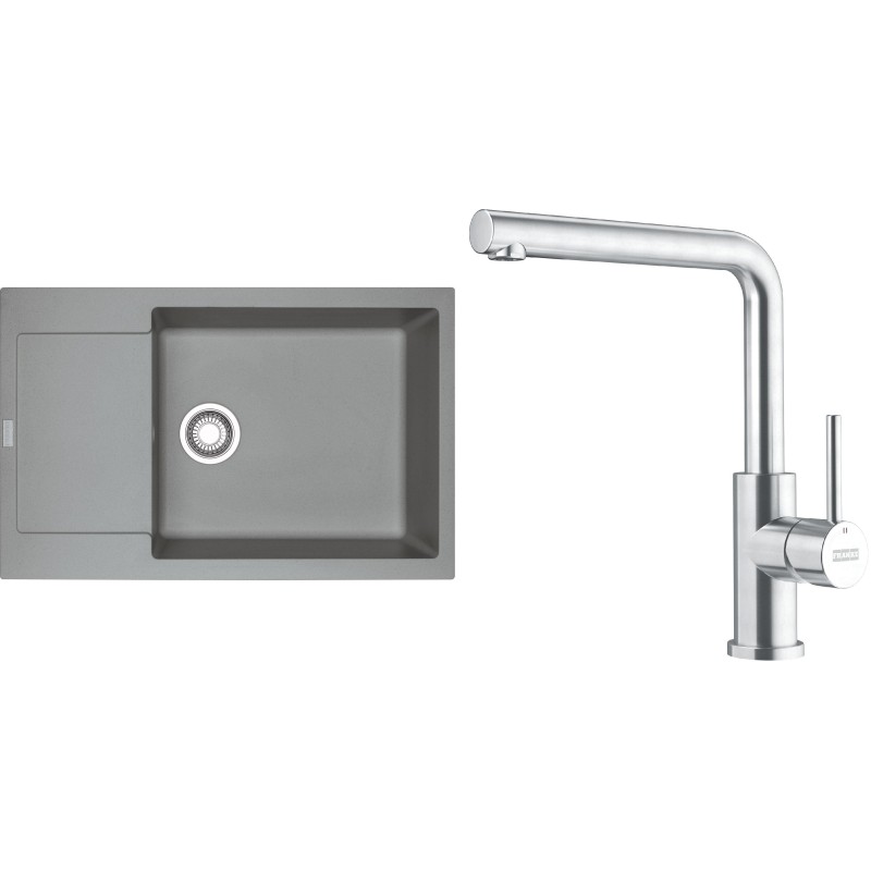 Cenově zvýhodněný set Franke G301ŠK obsahuje granitový dřez s odkapem MRG 611-78 BB Šedý kámen a baterii FC 6985.501 SMART GLENDA Celonerez.