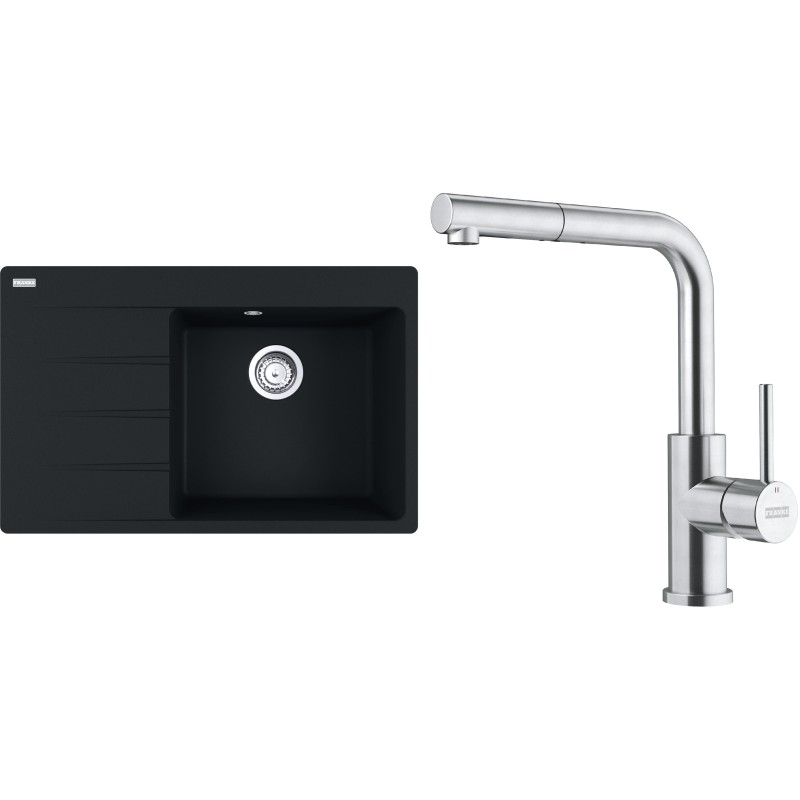 Cenově zvýhodněný set Franke G289MČ obsahuje granitový dřez s odkapem CNG 611-78 TL/7 Matná černá a baterii s vytahovací koncovkou FC 6986.501 SMART GLENDA Celonerez.