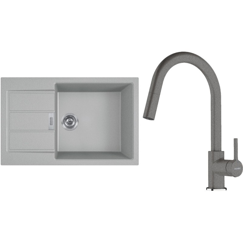 Cenově zvýhodněný set Franke T132Š obsahuje Tectonite dřez s odkapem S2D 611-78 XL Šedá a baterii s vytahovací koncovkou FC 6051.084 LINA Šedý kámen.