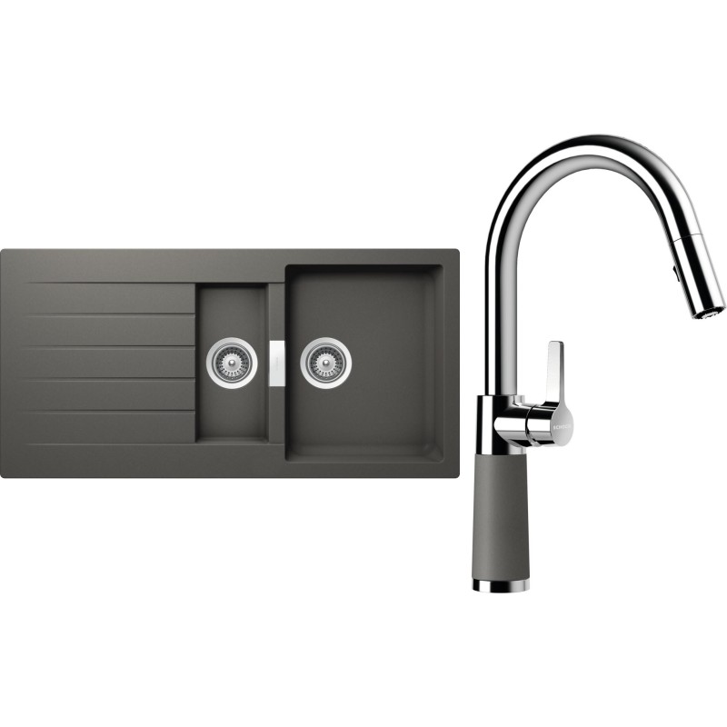 Cenově zvýhodněný set dřezu a baterie Schock S3-7 - obsahuje granitový dřez s vaničkou a odkapem Signus D-150 Silverstone a baterii se sprchou SC-520.120 Silverstone.