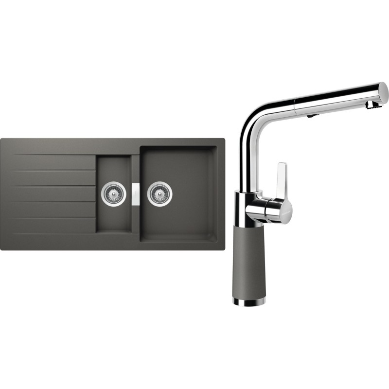 Cenově zvýhodněný set dřezu a baterie Schock S3-11 - obsahuje granitový dřez s vaničkou a odkapem Signus D-150 Silverstone a baterii se sprchou SC-540.120 Silverstone.