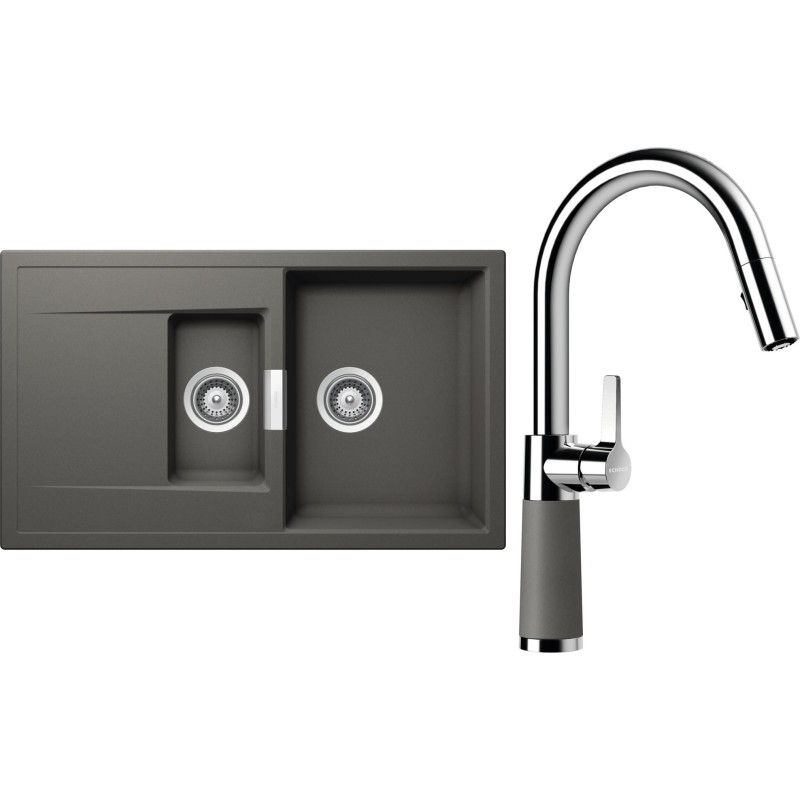 Cenově zvýhodněný set dřezu a baterie Schock S7-7 - obsahuje granitový dřez s vaničkou a odkapem Mono D-150 Silverstone a baterii se sprchou SC-520.120 Silverstone.