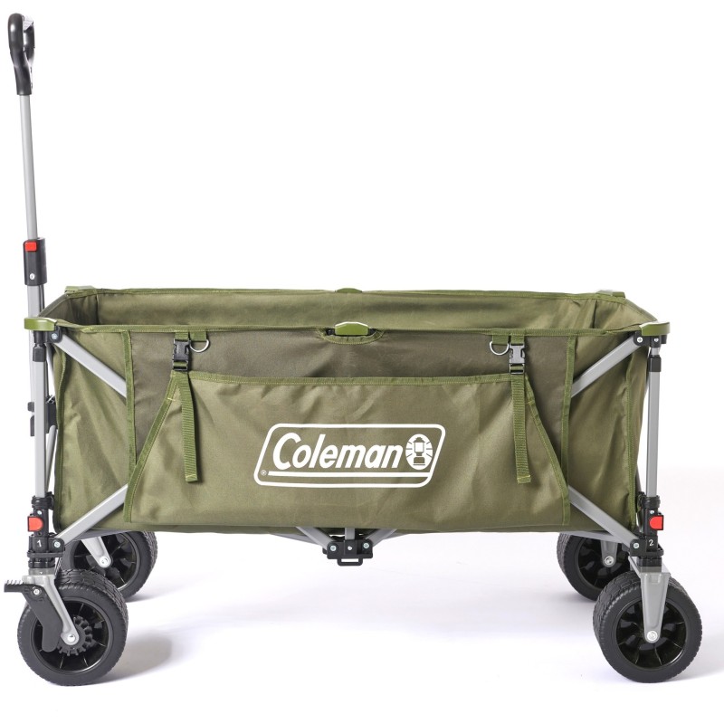 Robustní skládací vozík vhodný pro přepravu spacáků, chladicích boxů, stanů a dalšího vybavení. Disponuje integrovaným úložným prostorem, bočními kapsami a dlouhou skládací rukojetí. Široká terénní kolečka s brzdou zajišťují stabilní jízdu na různých površích a lze je snadno odejmout stisknutím tlačítka.